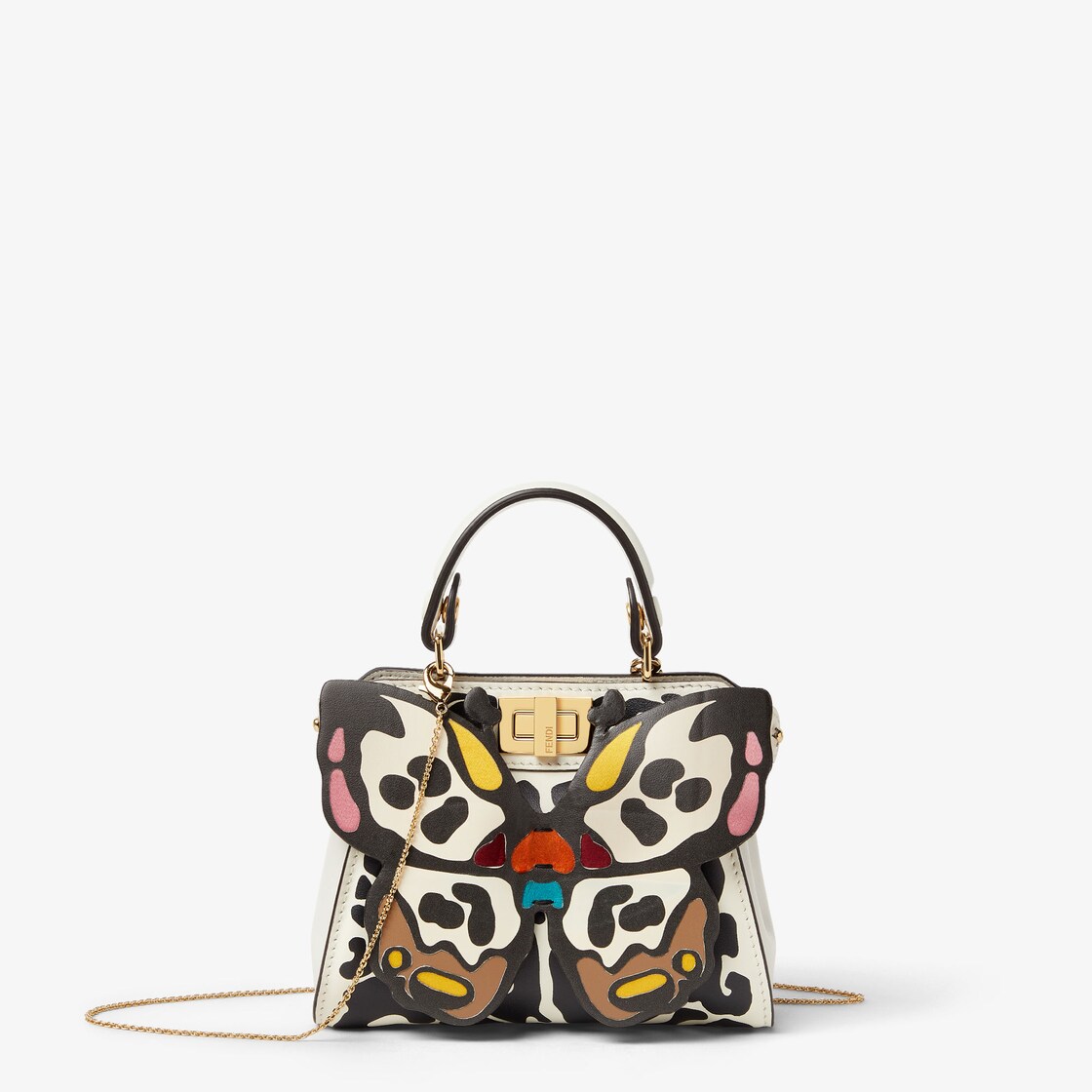 Die ikonische Tasche Peekaboo in Nano-Ausführung wurde bis ins kleinste Detail nachempfunden. Mit zwei mit Leder gefütterten Innenfächern, die durch eine feste Trennwand getrennt sind, einem abnehmbaren Griff mit zwei Druckknöpfen und der ikonischen Drehschließe. Dank der schmalen Schulterkette kann die Tasche als Handtasche oder als Umhängetasche getragen werden. Aus bedrucktem Kalbsleder mit abstraktem Motiv in Weiß und Schwarz, das von Schmetterlingsflügeln inspiriert ist. Die elegante Applikation auf der Vorderseite aus mehrfarbig bedrucktem Leder erzeugt einen Maxi-3D-Schmetterling. Beschläge aus Metall mit Finish in Gold-Optik.