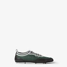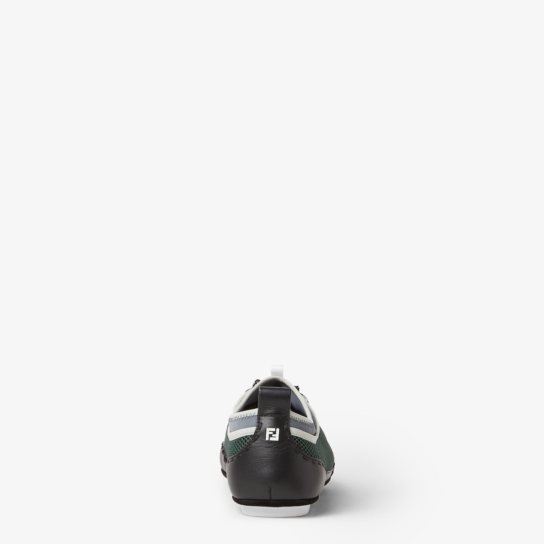 Low-Top-Schnürschuh Fendi Fit. Aus leichtem Mesh in Petrolgrün und weichem Leder in Schwarz mit handgefertigten Makronähten Ton-in-Ton, die für die legendäre, von den Fendi-Handwerkern und -Handwerkerinnen seit 1925 weiter fortgeführte Selleria-Verarbeitung stehen. Die flexible Beutelkonstruktion mit Einsatz aus Scuba-Stoff und Zunge an der Ferse sorgen für einen optimalen Komfort. Dreifarbige Schnürsenkel mit Trekking-Motiv. Sohle mit kontrastierenden Gummieinsätzen mit Fendi-Motiv.