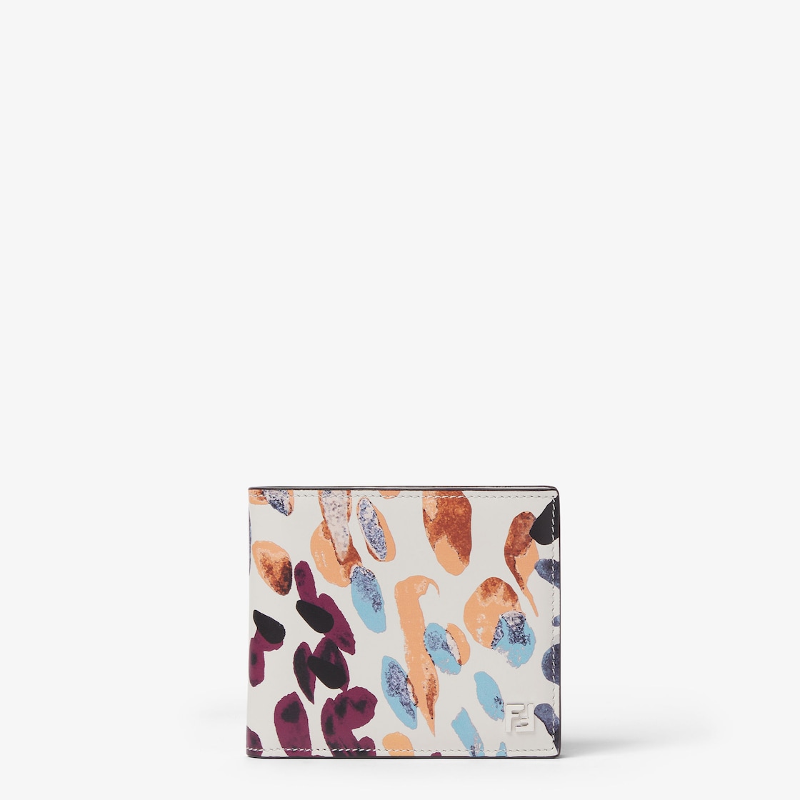 Portemonnaie mit acht Kartensteckfächern und zwei Fächern für Geldscheine. Aus glattem Kalbsleder in Hellgrau mit mehrfarbigem Fendi Falena Print mit halbglänzendem Finish. Innenseite aus Leder in Hellgrau. Squared FF-Motiv aus Metall mit Finish in Palladium-Optik.