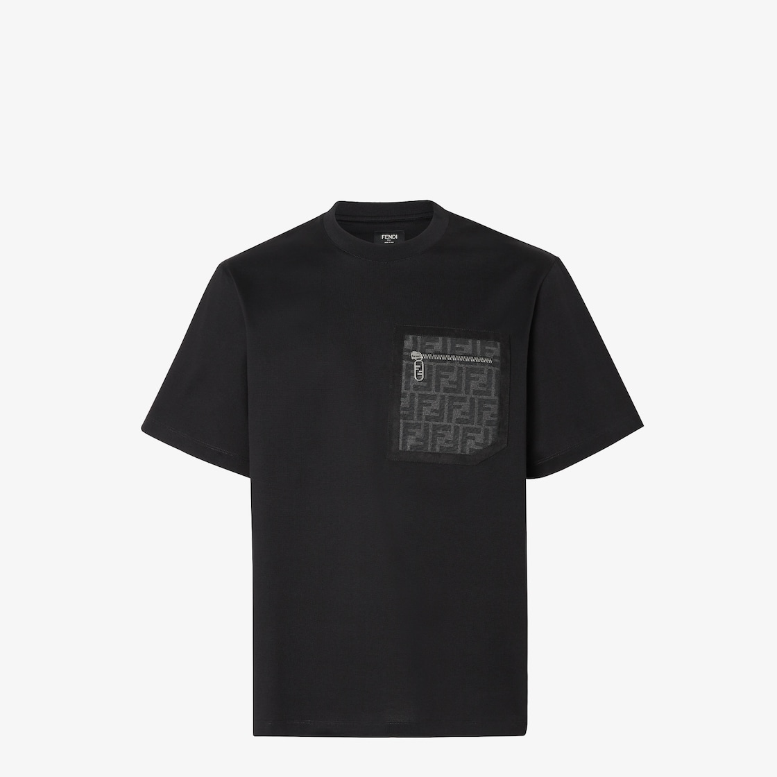 Skater-T-Shirt mit Reißverschlusstasche auf der Brust. Mit Rundhalsausschnitt und kurzen Ärmeln. Aus Baumwolljersey in Schwarz. Die Brusttasche ist mit einem Einsatz aus Stoff mit FF-Jacquard und einer farblich abgestimmten Einfassung aus Leder versehen.