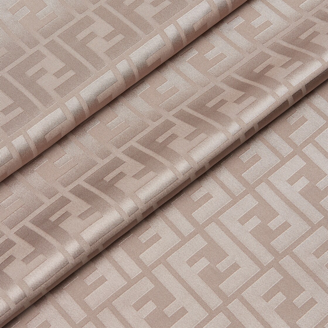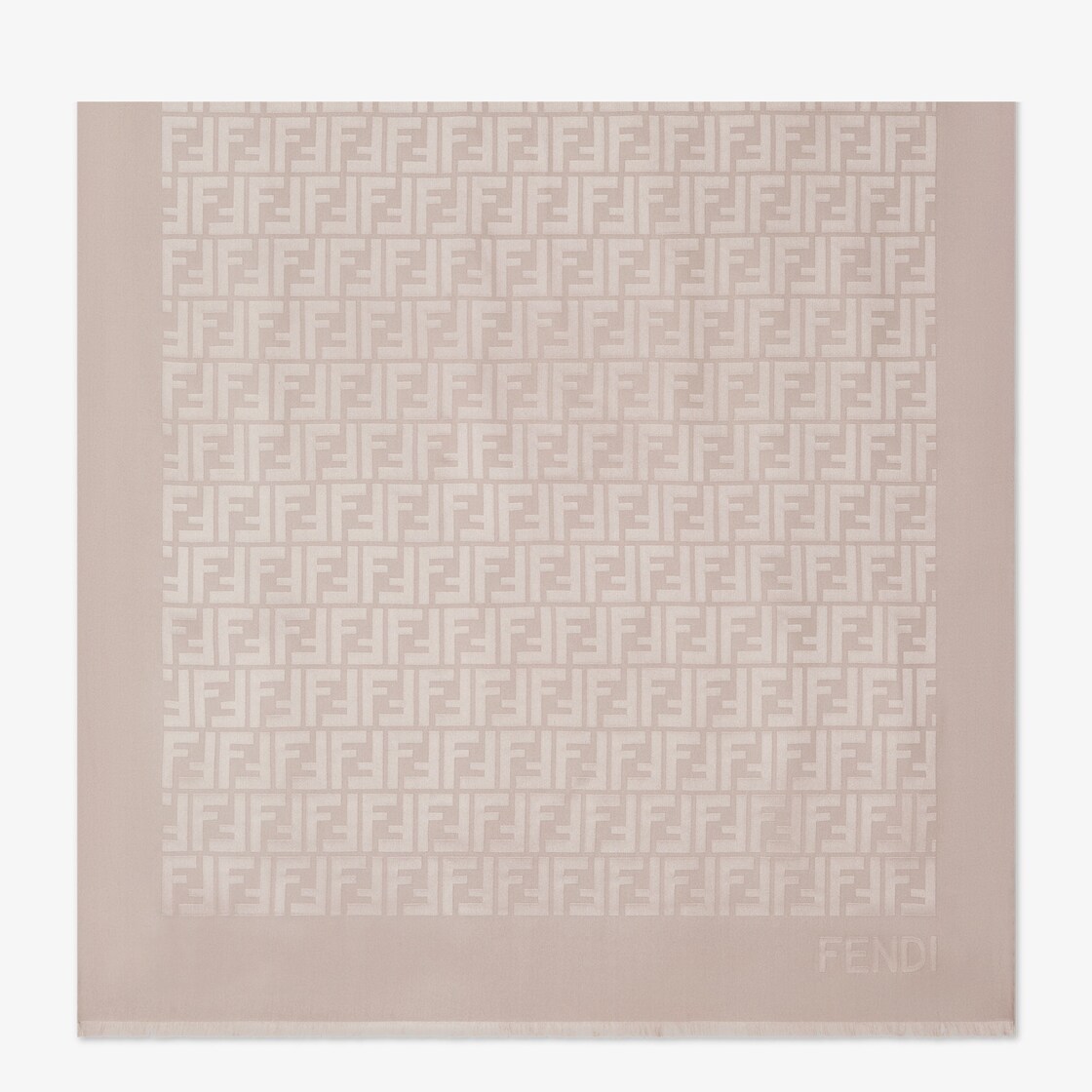 Breite rechteckige Stola aus organischer Seide in Taupe. Durchgehendes FF-Jacquardmuster. Von Hand ausgefranster Saum.