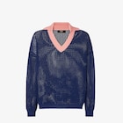 Oversize-Pullover mit langen Ärmeln. Polokragen mit V-Ausschnitt und Ärmeln mit überschnittenen Schultern. Rippenbündchen. Aus Baumwollgarn in Blau mit durchgehendem Zopfstrickmuster mit transparenter Optik. Mit kontrastierendem Kragen mit Colorblock-Design in Rosa.