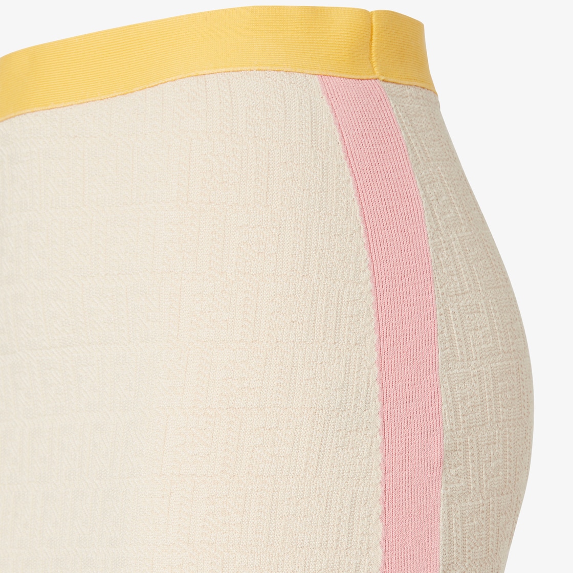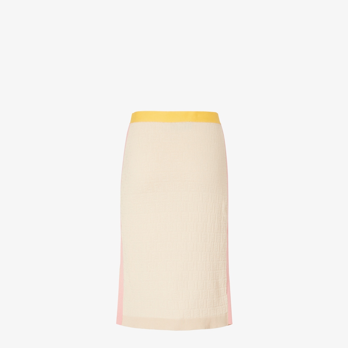 Midi-Rock in gerader Form mit elastischem Bund. Aus Baumwoll- und Seidengarn in Hellbeige mit dem ikonischen, durchgehenden FF-Jacquard-Motiv. Mit kontrastierenden Colorblock-Einsätze an der Taille und an den Seiten in Gelb und Rosa.