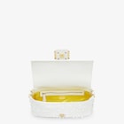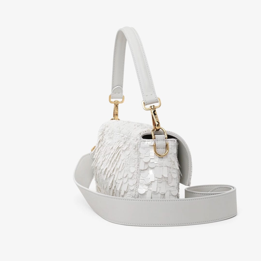 Kultige, mittelgroße Baguette Tasche, durchgehend mit Metall-Pailletten in Weiß in verschiedenen Formen und Größen bestickt. Mit FF-Zierschließe.