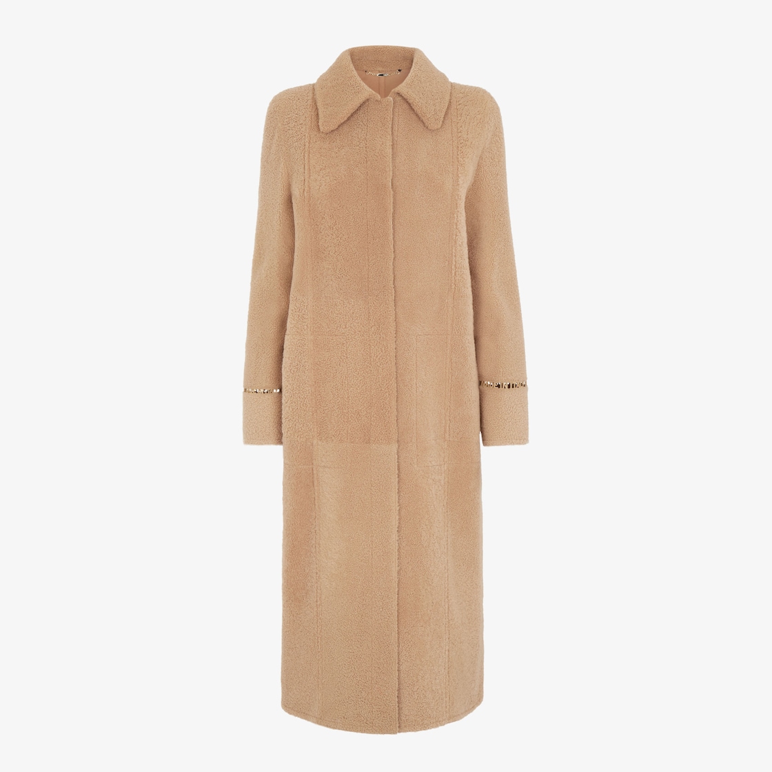 Langer Mantel mit geradem Fall, Hemdkragen und lange Ärmel. Seitentaschen und mittigem Rückenschlitz. Auf Shearling mit einem angenehm weichen Griff. Die Ärmel sind am Saumabschluss mit einer Ajourstickerei „Fendi Roma Made in Italy“ veredelt. Verschluss bezogenen Knöpfen aus Leder.