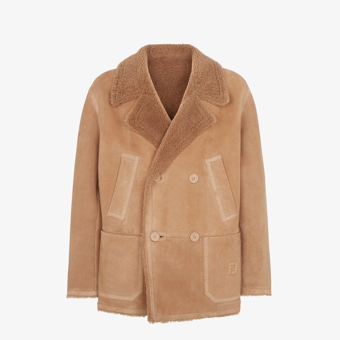 Doppelreihiges Blouson mit Reverskragen und langen Ärmeln. Handwärmertaschen und aufgesetzte Taschen am Saum. Verschluss mit Knopfleiste. Aus Schaffell in Hellbraun. Mit FF-Logo als Relief auf der linken unteren Tasche.