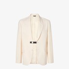 Einreihiger Blazer mit mittigem Rückenschlitz. Revers, Brusttasche und Paspeltaschen mit Patte vorne. Verdeckte Knopfleiste. Aus Wollgabardine in Beige. Das Kleidungsstück ist mit einem abnehmbaren Riemen aus Leder in Schwarz mit Fendi-Detail aus Metall und Knopflöchern versehen, die es ermöglichen, die Passform anzupassen und das Volumen der Silhouette zu definieren. Mit aufgesticktem FF-Selleria am Ärmel. Teilgefüttert mit FF-Cupro.