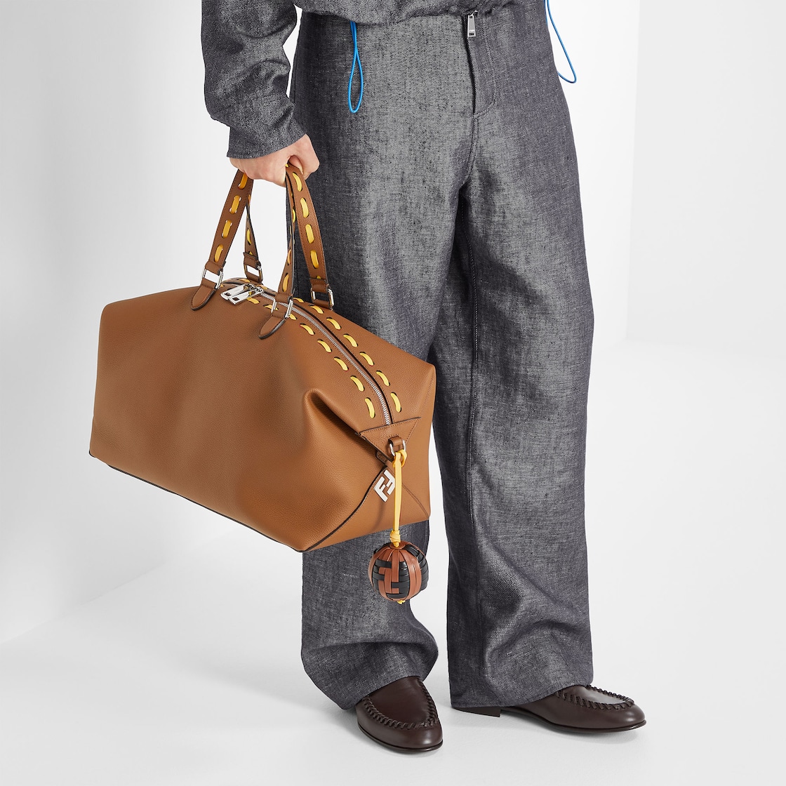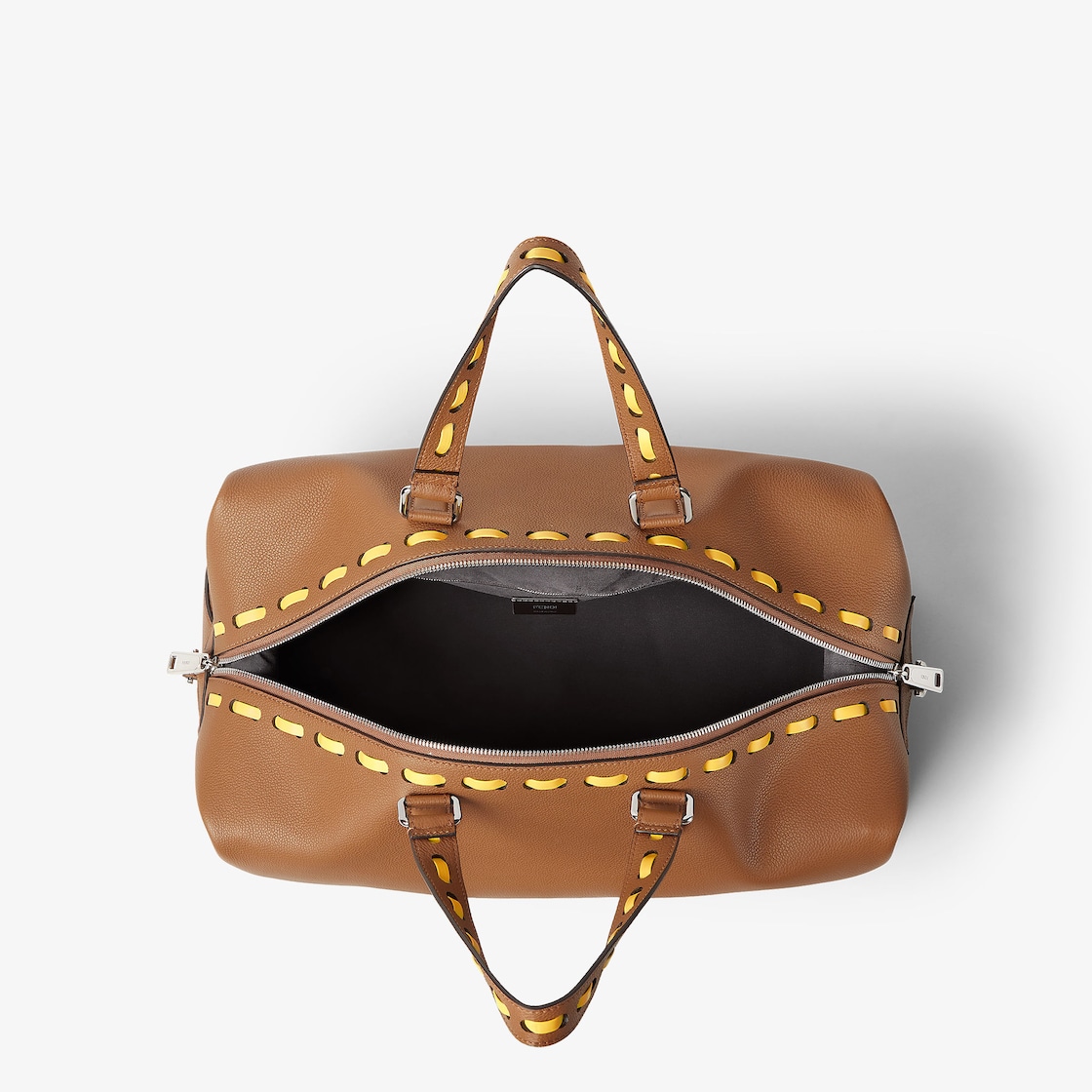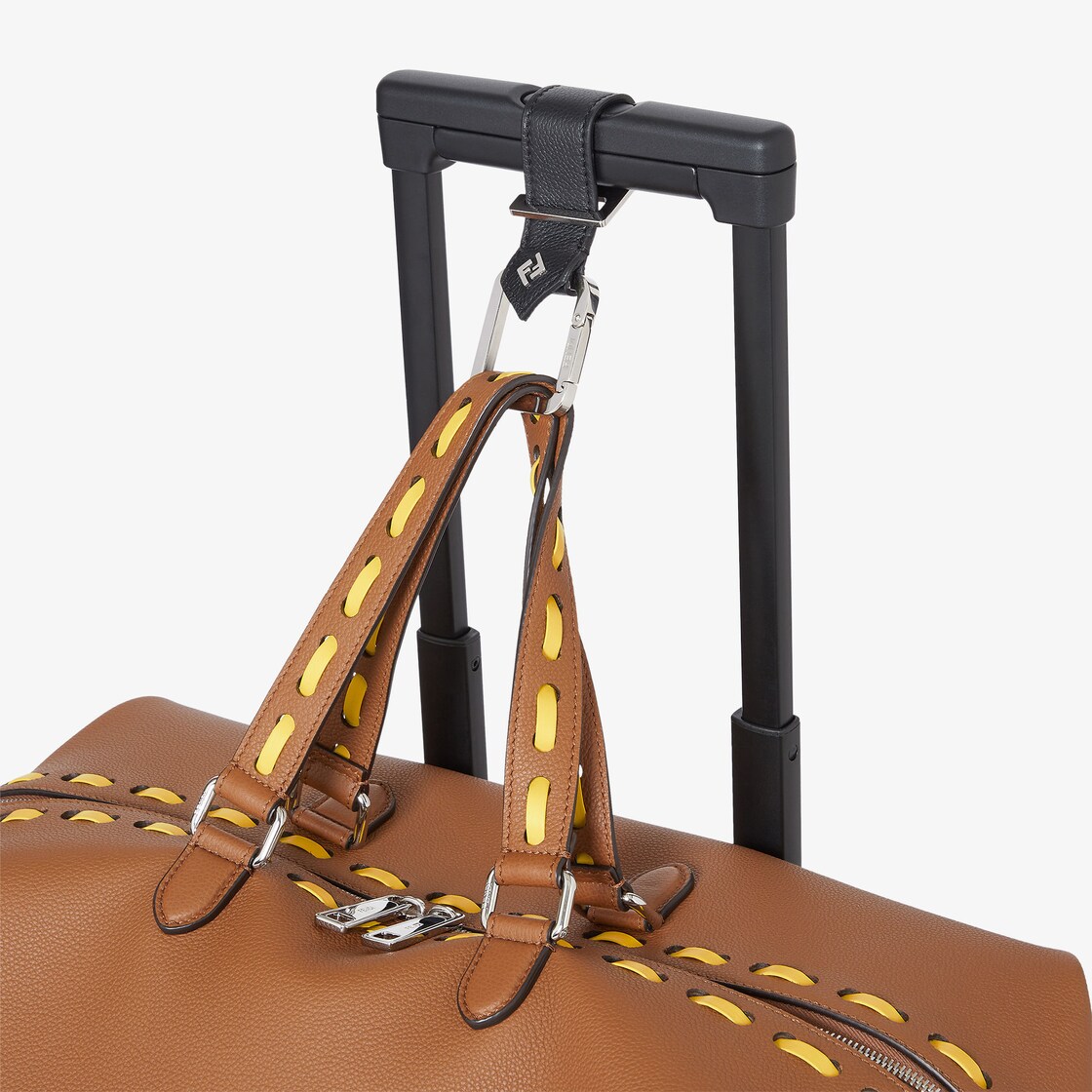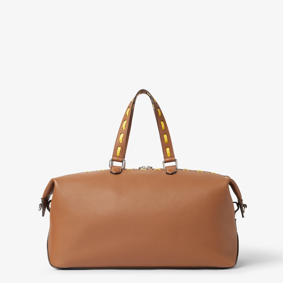 Sac de voyage léger Fendi Lui, moyenne dimension 45 cm, réalisé en cuir de veau souple grainé naturel et orné d’applications FF en métal aux angles. Orné de gros points jaune tournesol cousus main, un emblème de la finition iconique Selleria que les artisans Fendi perpétuent depuis 1925.