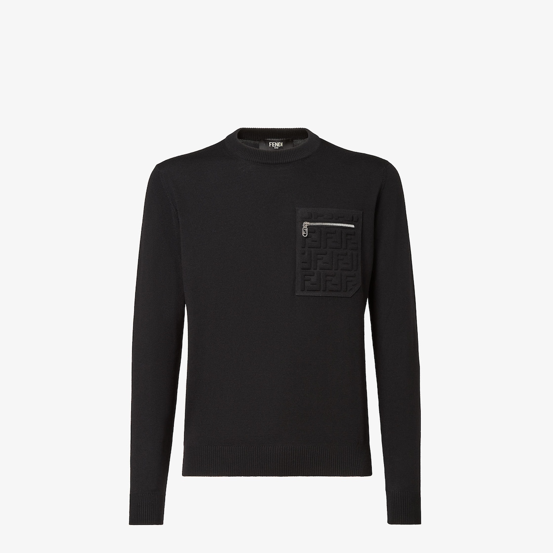 Pull à col rond avec manches longues. Coupe classique. En fil de laine noir. Poche poitrine zippée ornée du motif FF en relief dans le ton et du curseur Fendi O’Lock en métal finition palladium.