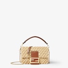 Sac Baguette® emblématique format mini réalisé en raphia de teinte naturelle, souligné par un tressage raffiné en relief fait à la main. Détails en cuir de veau marron sellier et fermoir FF.