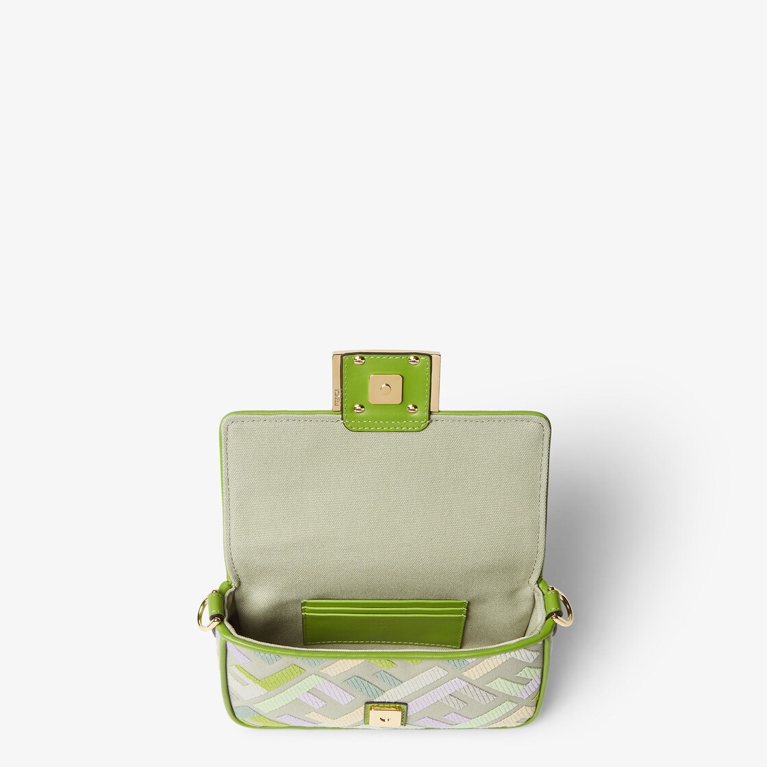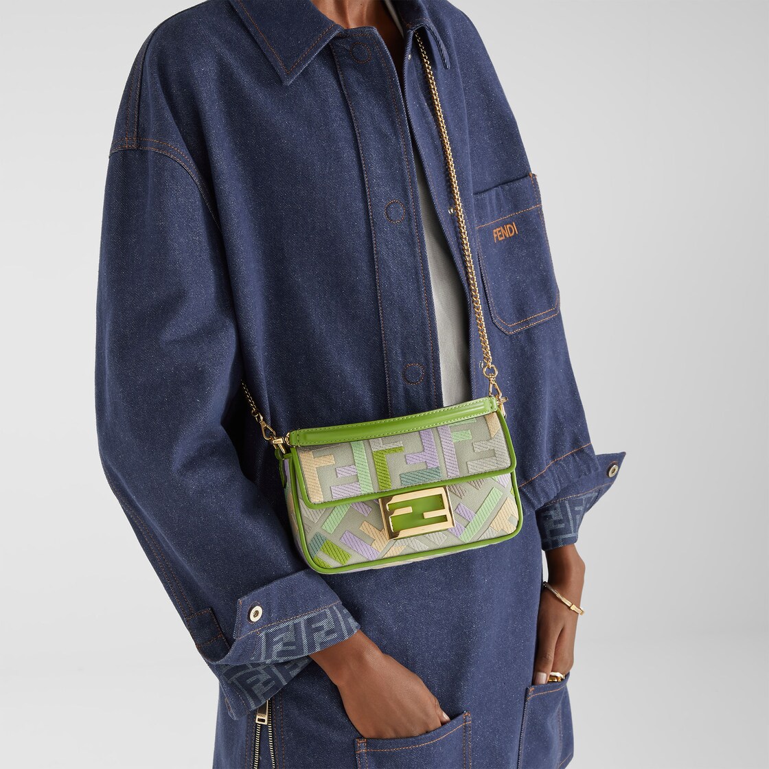 Sac Baguette® iconique, format mini, en toile verte avec motif FF emblématique brodé en relief avec du fil multicolore et fermoir FF. Détails en cuir vert.