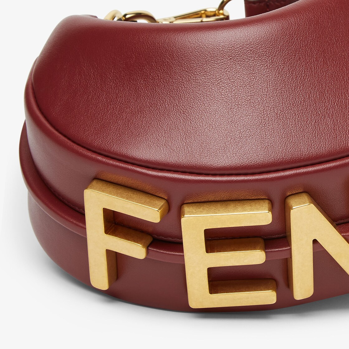 En cuir de veau bordeaux orné de l’inscription FENDI en métal doré vintage sur le fond, visible lorsque le sac est porté sous le bras.