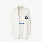 Veste à boutonnage simple à col à revers et emmanchures basses avec poignet élastique. Poche poitrine et poches passepoilées appliquées sur le devant. Fermeture boutonnée. En toile technique blanche. Broche Sunny Side Flowers décorative amovible sur la poitrine dans les tons bleus. La ceinture élastique intégrée sur le bas et les brandebourgs amovibles en cuir, réglables à l’aide de boutonnières, permettent d’ajuster la taille et de définir le volume de la silhouette. Doublure en jacquard micro FF blanche.