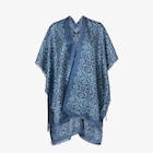Poncho large et enveloppant, avec liens à nouer sur les côtés. En soie imprimée bleu effet denim fantaisie combinant le motif FF emblématique et des détails floraux. Bords à franges.