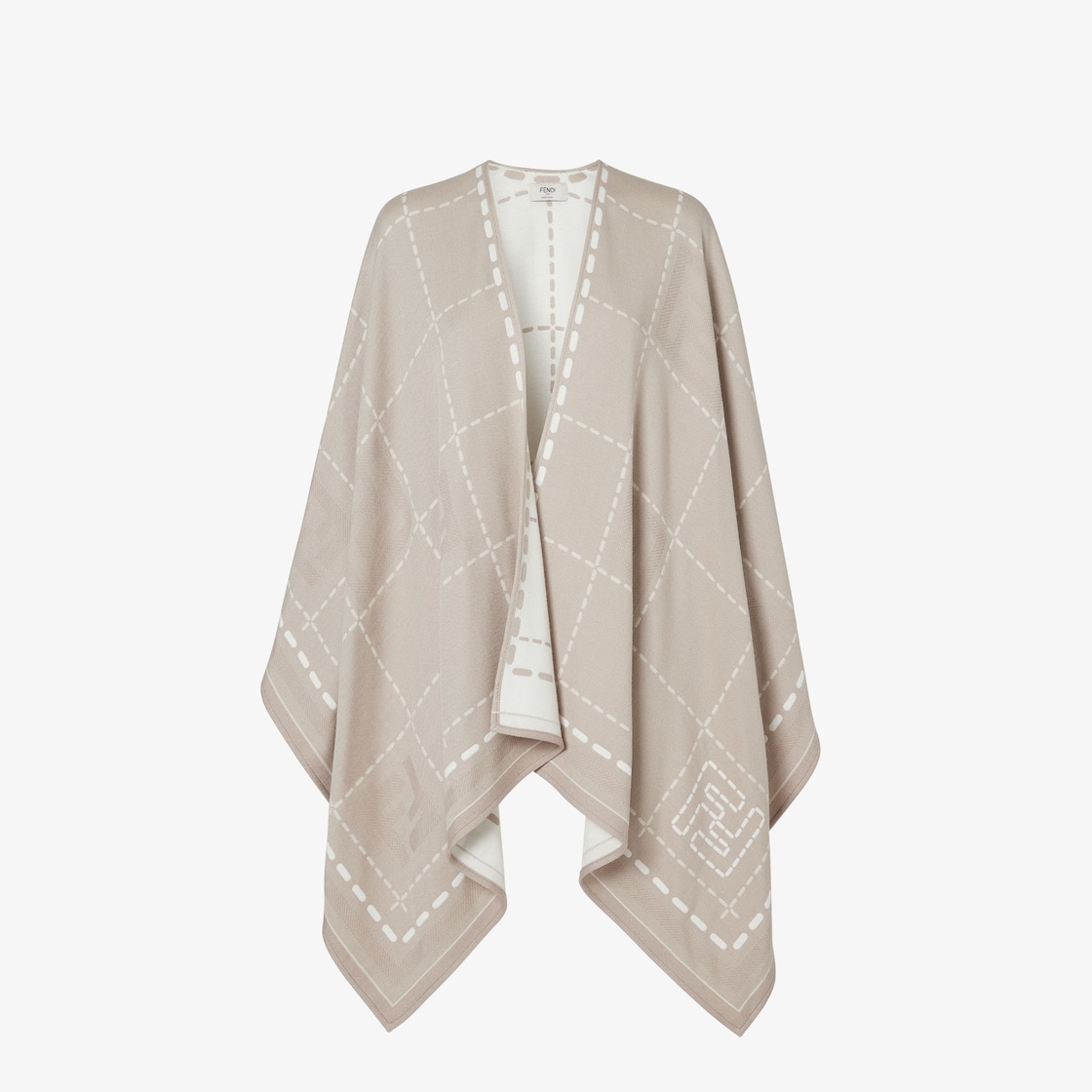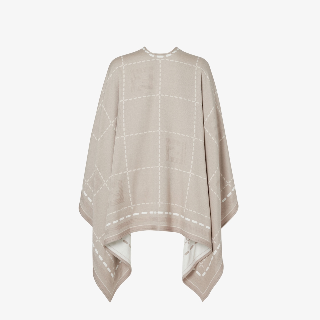 Poncho léger en fil de pure laine ivoire avec des détails gris taupe. Le motif macro check Selleria crée un effet tridimensionnel raffiné grâce au jeu de textures. Détails en jacquard FF et intérieur contrasté dans les tons gris taupe clair.