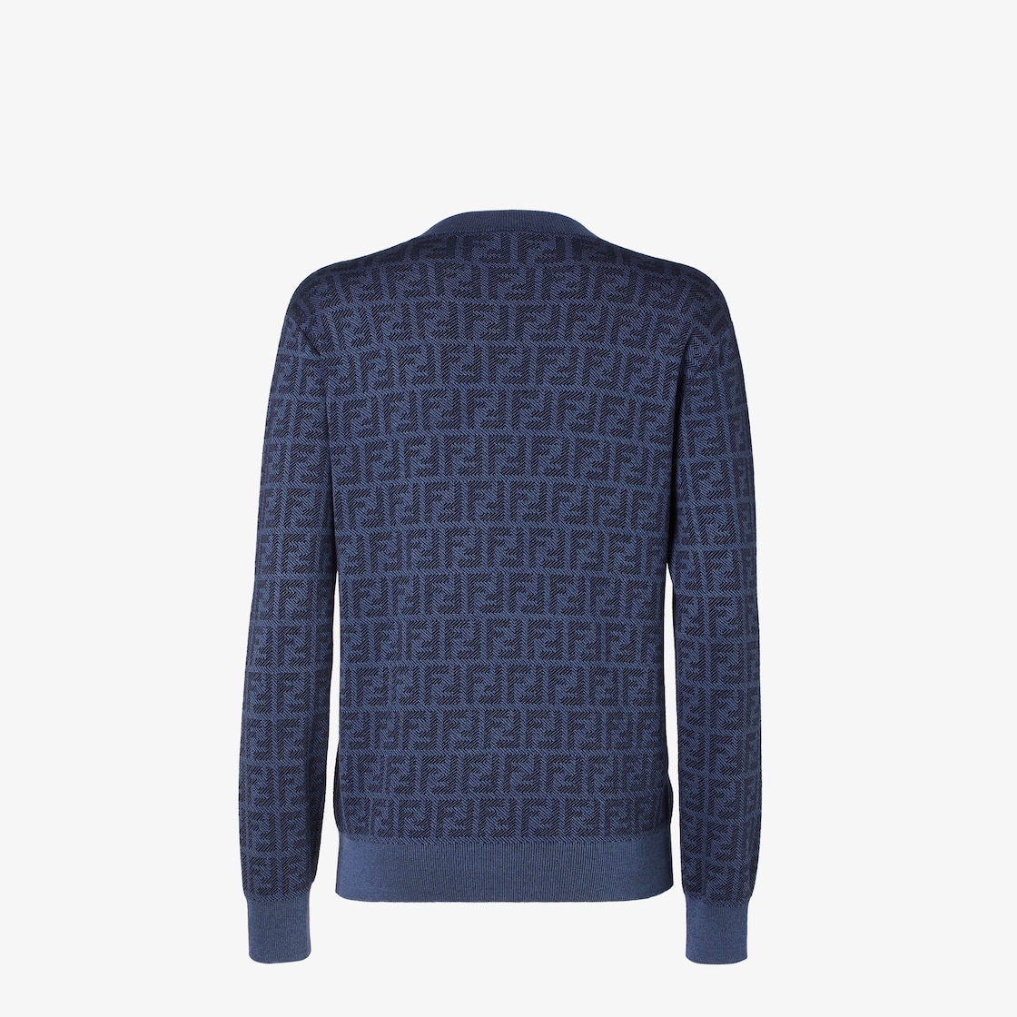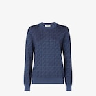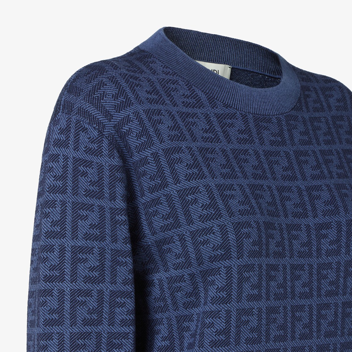 Pull coupe regular à encolure ronde et manches longues. En fil de laine et soie avec motif FF jacquard effet denim dans les tons bleu foncé. Finition bords côtelés.