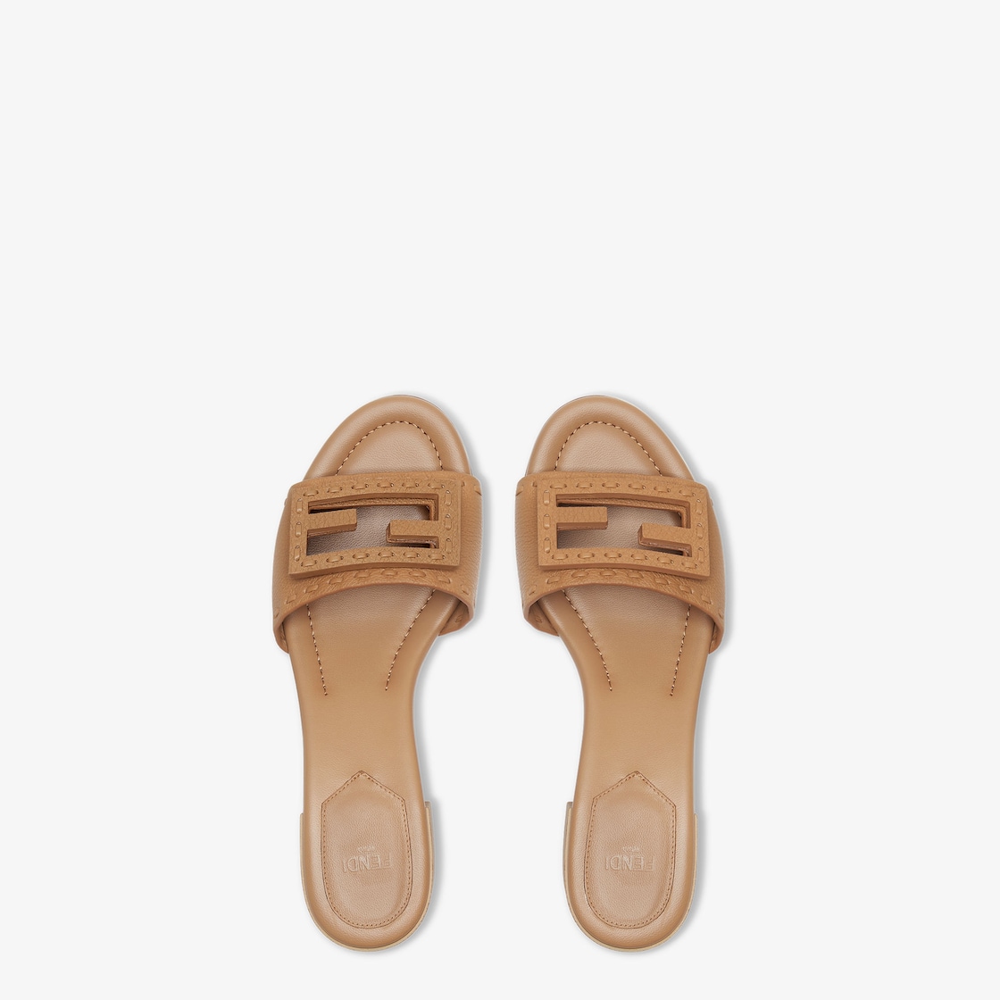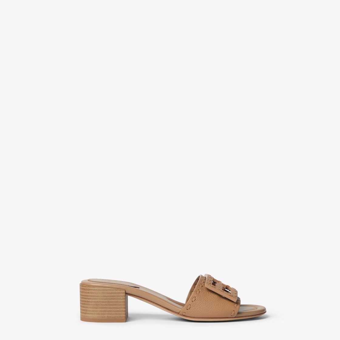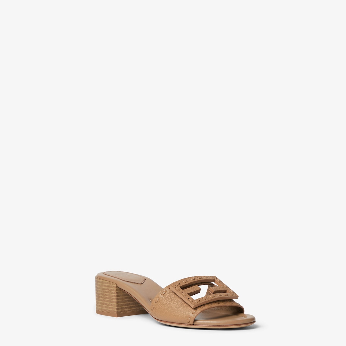Sandales à large bride. En cuir de veau foulonné marron clair et rehaussé de grandes surpiqûres ton sur ton cousues main, emblème du travail Selleria iconique que les artisans Fendi perpétuent depuis 1925. Ornées du motif FF Baguette ton sur ton. Talon large habillé de cuir.