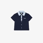 Chemise bébé en seersucker bleu marine avec petit col et boutons en maille bleu ciel finement côtelée et broderie Fendi sur le devant.