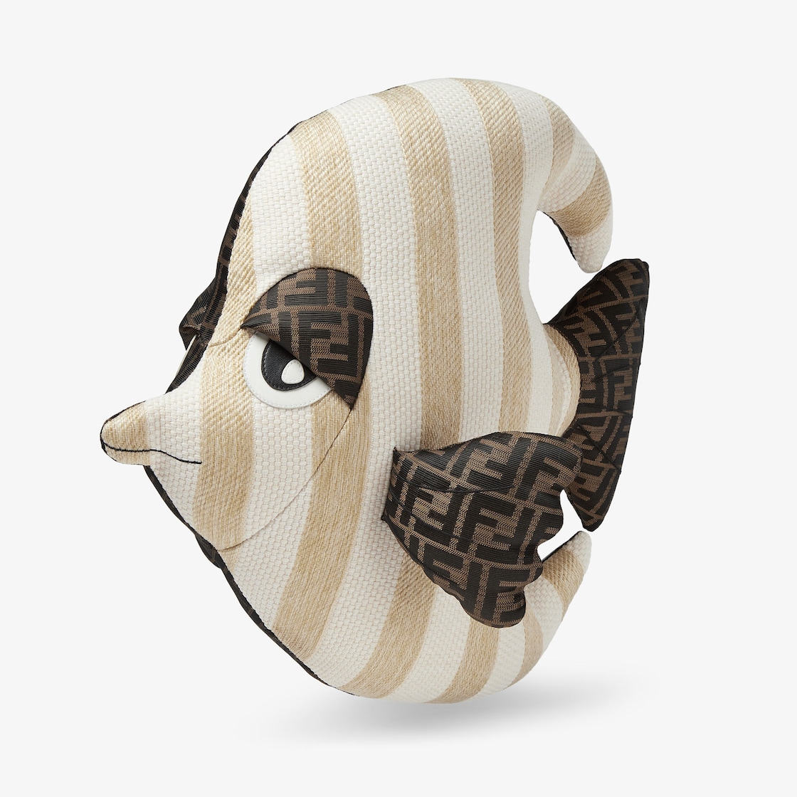 Grand coussin poisson en Pequin jacquard dans les tons blanc et sable d’un côté et en nylon imprimé effet jacquard avec logo FF intégral couleur tabac de l’autre côté. Yeux en cuir.