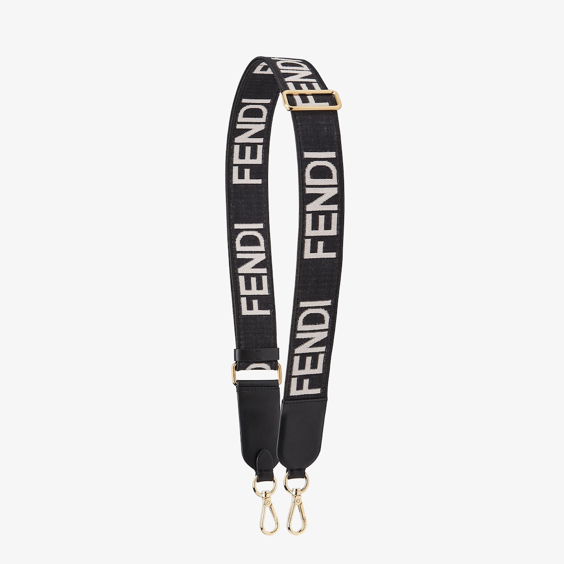 Longue bandoulière réglable avec double pince, à utiliser avec tous les sacs dotés d’attaches. En tissu double jacquard dans les tons de noir, inscription Fendi sur un côté et motif floral sur l’autre. Les deux côtés présentent des détails en cuir noir. Garnitures en métal finition dorée.