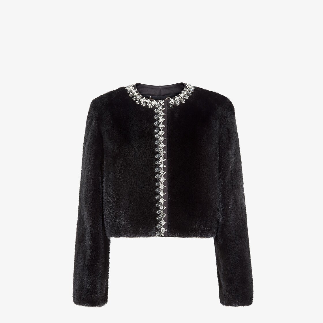 Blouson à col rond avec coupe raccourcie à la taille. S’inscrivant dans la collection réalisée en collaboration avec le designer Stefano Pilati, ce modèle est proposé en vison noir à poil long. Le modèle est rehaussé de cristaux de formes et dimensions variées brodés sur le col et le devant.