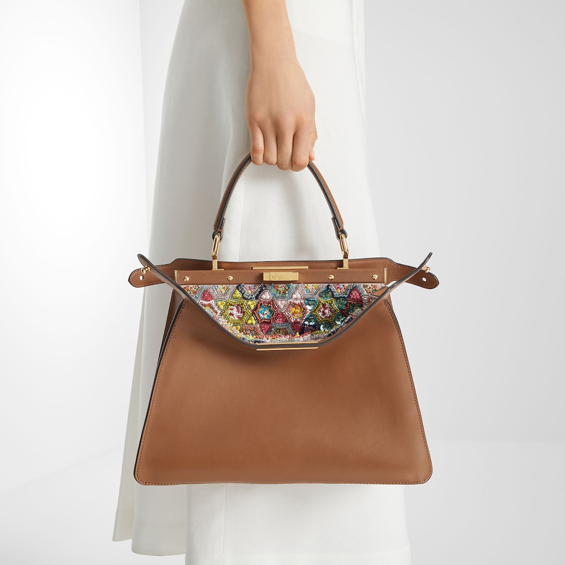 Sac iconique Peekaboo ISeeU, moyen format, quintessence du savoir-faire et de la créativité de Fendi. Icône intemporelle, le sac Peekaboo a été créé en 2009. À l’instar du jeu enfantin de cache-cache dont il prend le nom, peek-a-boo, le sac joue sur l’alternance entre beauté extérieure apparente et beauté intérieure cachée.