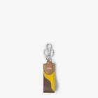 Portachiavi con moschettone e anello logati. Realizzato in pelle granata colorblock con intarsi nei toni del marrone, beige e giallo. Decorato con logo Fendi stampato a caldo in color argento. Accessori metallici con finitura palladio.