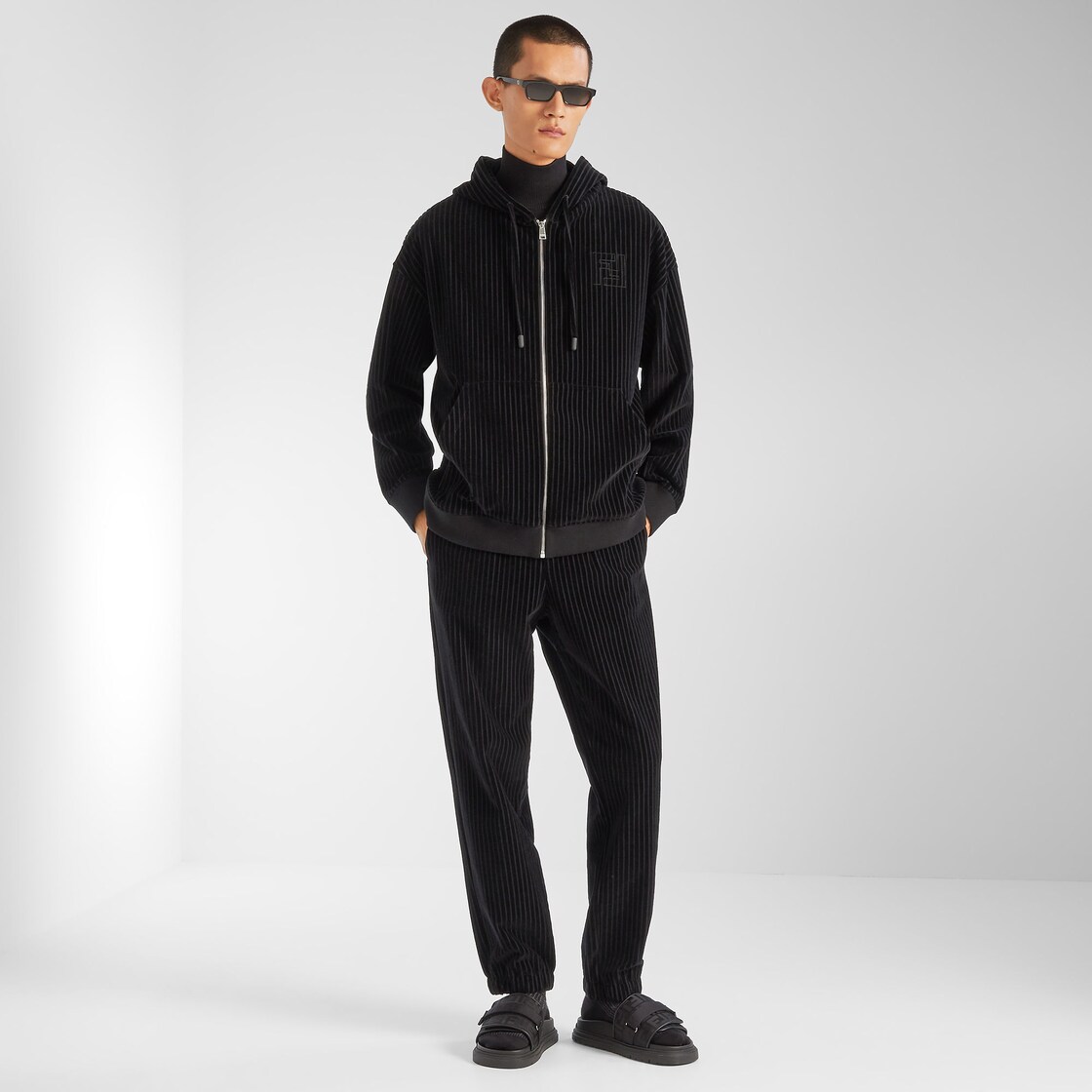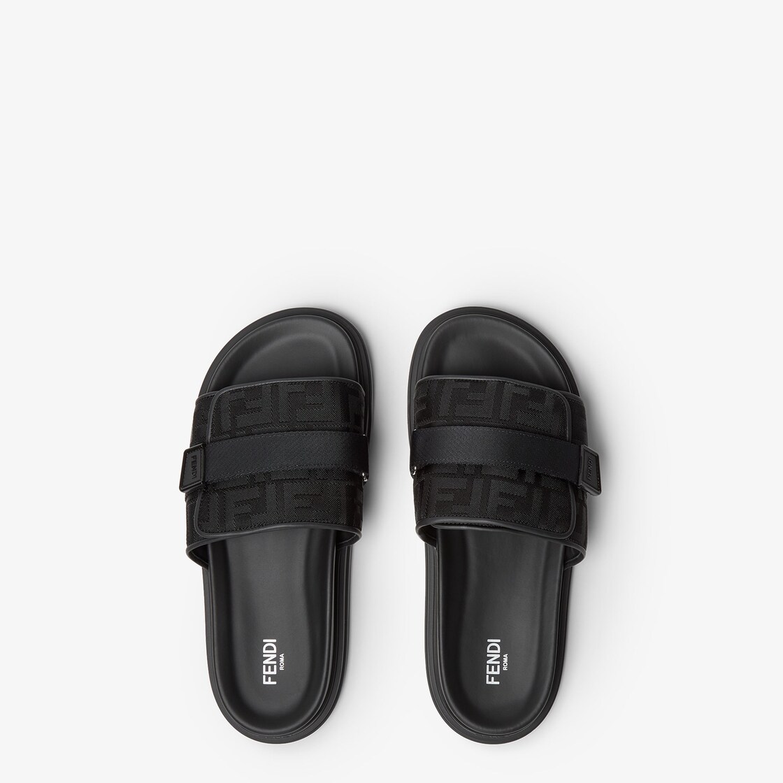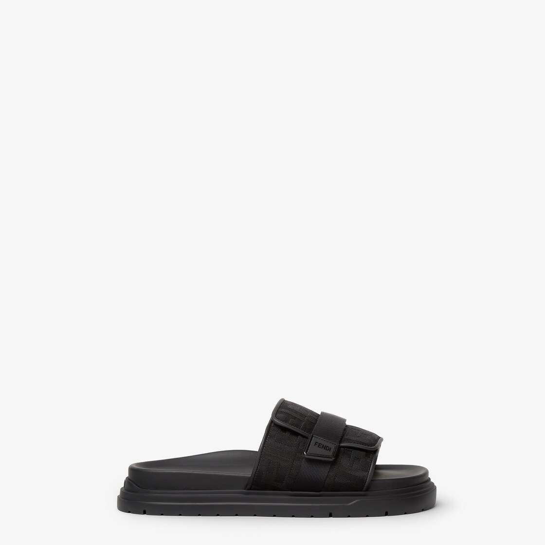 Sandalo a fascia larga con chiusura a strappo regolabile. Realizzato in Nylon Jacquard FF nero e nastro tecnico con logo tono su tono e impreziosito da piping in pelle. Dettagli, suola interna e fodera in pelle tono su tono. Suola sagomata in gomma antiscivolo.