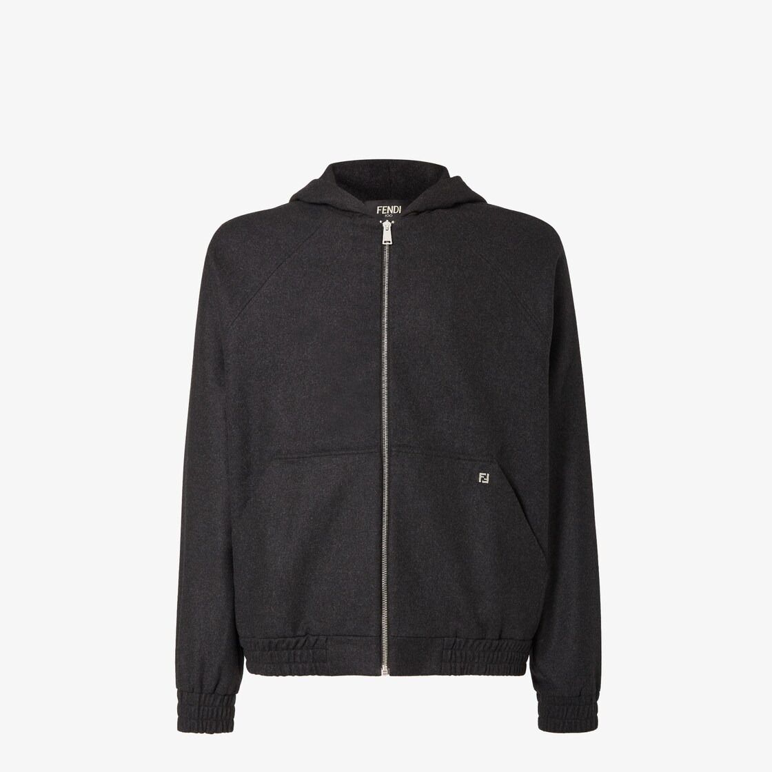 Felpa con cappuccio a coulisse e maniche raglan. Polsini e fondo elastici. Tasche a marsupio sul davanti. Chiusura frontale con zip. Realizzata in cashmere di colore grigio scuro. Dettaglio micro FF in metallo color palladio sulla tasca sinistra.