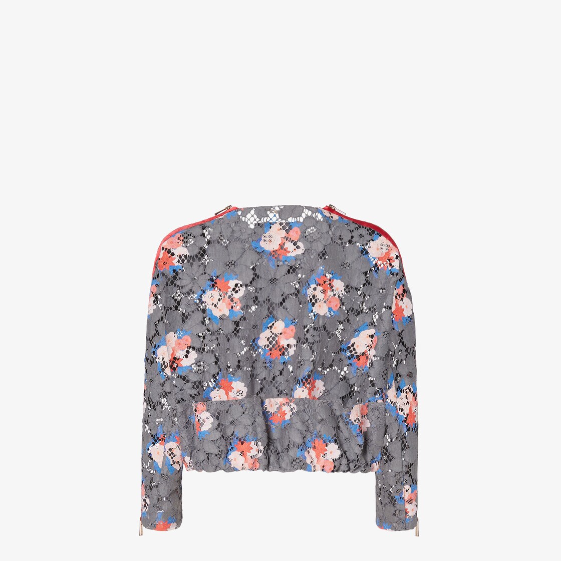 Giacca corta girocollo con due tasche applicate sul davanti e sul retro. Maniche 3/4 e bordo elastico al fondo, regolabile con asole per modulare la vestibilità e definire il volume della silhouette. Chiusura nascosta con bottoni a pressione. Sfoderata. Realizzata in pizzo grigio con motivo floreale d’archivio effetto see-through. Stampa Fendi Bouquet a contrasto nei toni del rosa e dell’azzurro. Il modello è caratterizzato da lunghe zip rosse a doppio cursore su entrambe le spalle e le maniche.