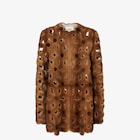 Cappotto midi con scollo a giro e maniche lunghe. Chiusura nascosta. Sfoderato. Realizzato in visone colore naturale, impreziosito da una lavorazione scolpita all over a fiori effetto see-through realizzati con tecnica laser. Rifinito da dettagli intarsiati in tonalità leggermente a contrasto.
