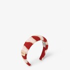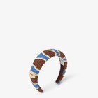 Cerchietto ricoperto in filato di cotone e rafia con lavorazione crochet a onde nei toni del rosa chiaro, rosso e beige. Rifinito da label in pelle beige con logo Fendi sul fianco e interno rifinito con nastro gros grain.