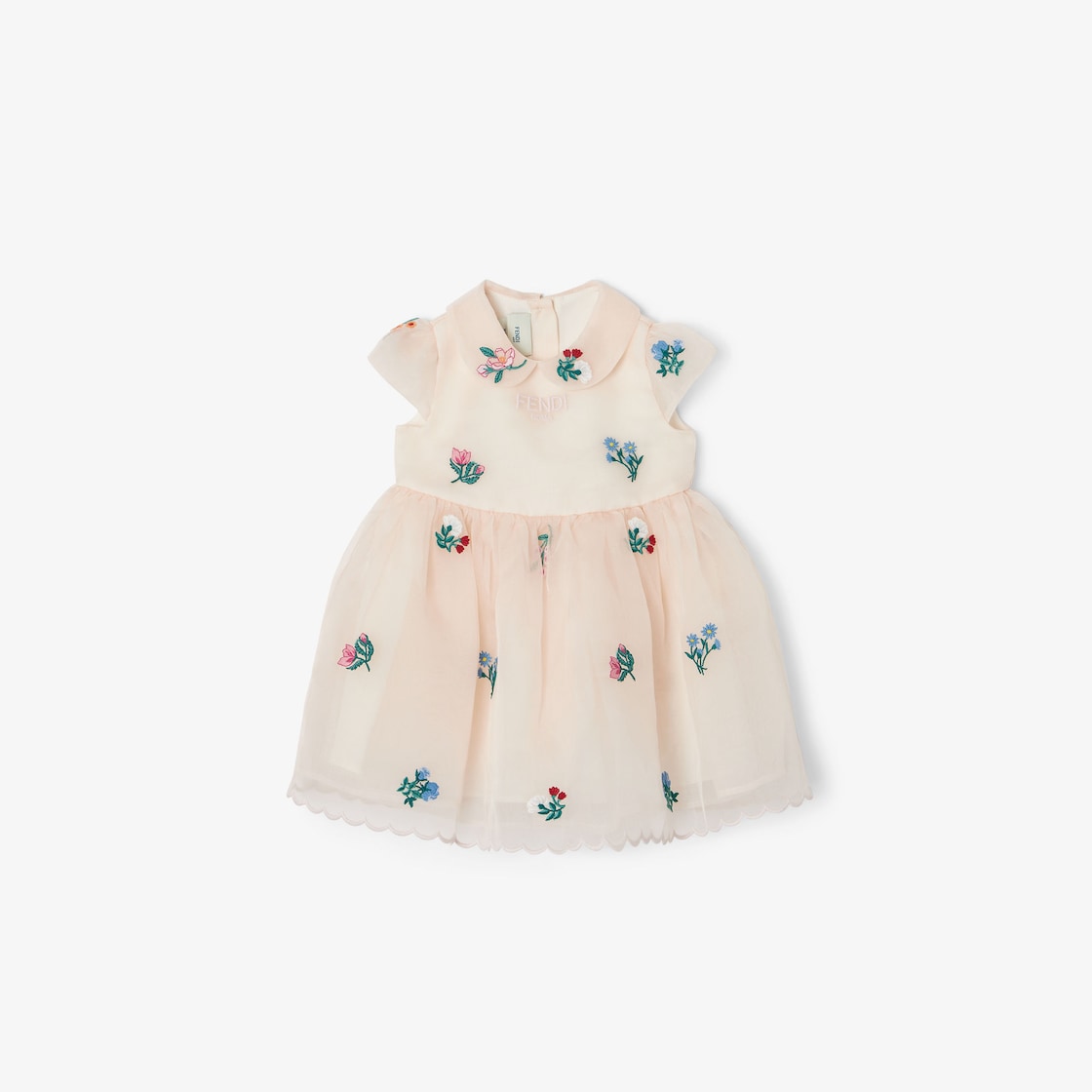 Abito baby in organza rosa chiaro con ricamo floreale multicolor all over.