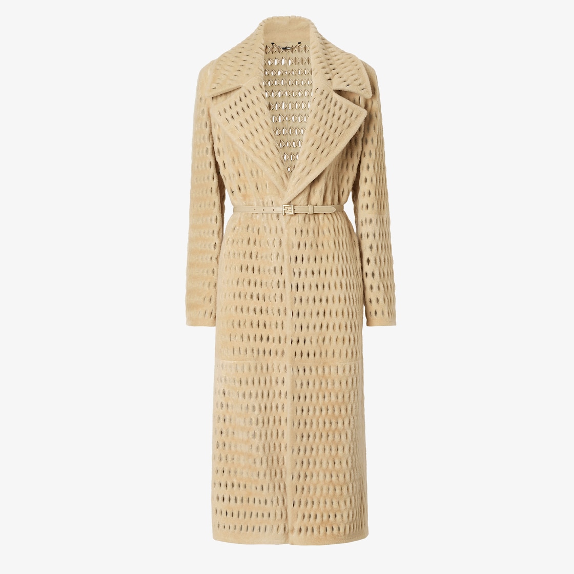 Cappotto midi a vestaglia con ampio collo a rever e cintura abbinata. Interno nappato. Realizzato in montone beige con una lavorazione a nido d’ape intagliata e cucita all’interno, che alleggerisce la struttura del capo creando un delicato effetto see-through.