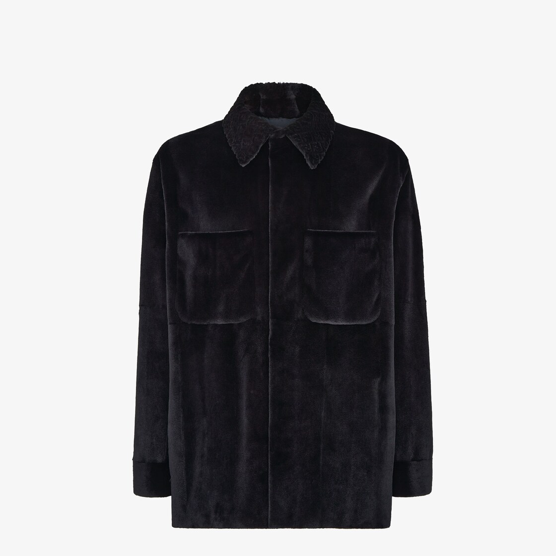 Blouson dalla linea dritta con colletto a camicia. Tasche applicate sul petto e polsini chiusi con bottoni a pressione nascosti. Chiusura nascosta. Realizzato in visone rasato color blu navy. Decorato con colletto micro FF laserato nelle stesse tonalità e patch Fendi Roma a rilievo applicato sul retro del collo.