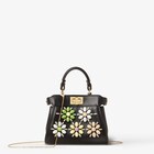 Iconic Nano Peekaboo bag with every detail recreated. Featuring a leather-lined interior, two compartments separated by a stiff partition, a removable handle with two press studs and the classic twist lock. Can be carried by hand or worn cross-body thanks to the fine chain shoulder strap. Made of black leather, decorated with multicoloured studs in different shapes and colours, carefully placed by hand to create the floral motif. Gold-finish metalware.