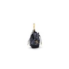 Nano backpack decorated with an FF clasp. Made of a denim-effect FF jacquard in shades of dark blue. Features a front flap, press stud button clasp and drawstring closure, with tone-on-tone leather cords and base. The snap hook allows it to be attached to larger bags or belts as a charm. Can be also be worn on the wrist thanks to the elasticated straps. Gold-finish metalware. Can hold a credit card, lipstick and headphones.