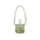 Iconic Nano Baguette bag with flap and mini FF clasp with press stud button. The snap hook allows it to be attached like a charm to larger bags or belts. It can also be carried by hand thanks to the padded and braided leather maxi shoulder strap in light green. Made of green fabric with contoured flap and embellished by an openwork embroidery with light green yarn. Gold-finish metalware.