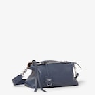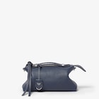 Customisable, hand-sewn Selleria charm in dark blue Cuoio Romano leather and long zip-pull with knot.