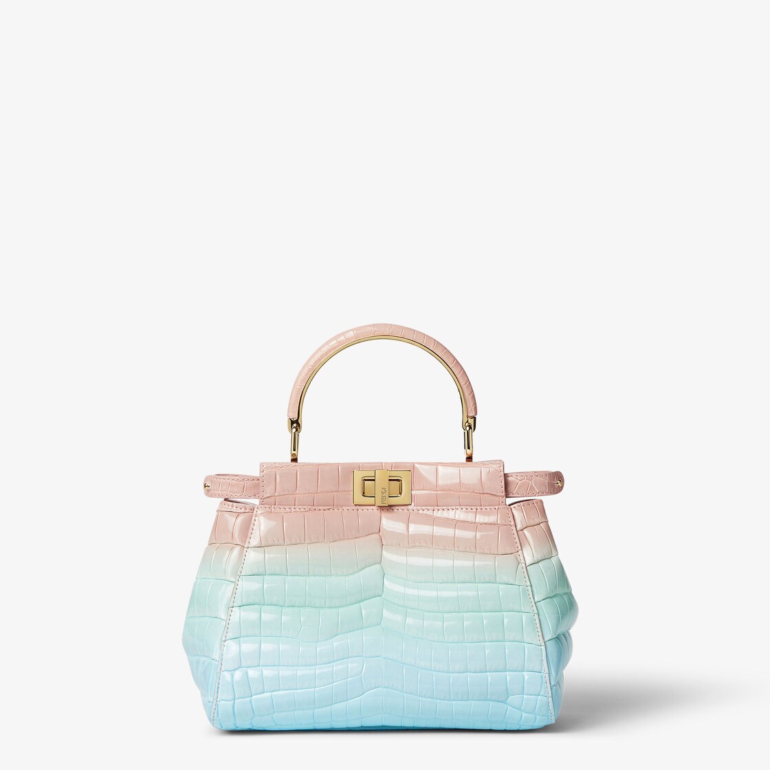 Made of exquisite crocodile leather, entirely gradient-shaded by hand from light pink to light blue, mimicking the colours of the Venetian dawn. The entirely hand-crafted process creates a unique gradient effect.
