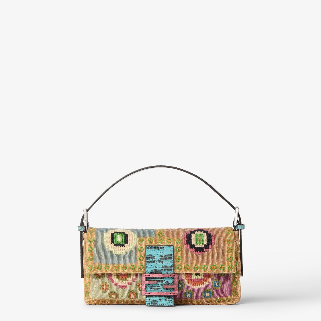 Since its debut in 1997, it has become a brand icon, now reimagined for the Fall/Winter 2026-27 collection drawing on its original version, number 26424. Hand-embroidered in a rich interplay of textures, the bag features 51,400 beads and intricate threadwork forming a vibrant, multicoloured motif requiring over 173 hours of expert craftsmanship. The Baguette® bag features a handle and shoulder strap in luxurious light blue Teju lizard leather, which are adjustable and removable for maximum versatility, as well as the signature FF buckle in contrasting Teju lizard leather. The accessory features a front flap with magnetic clasp, an interior lined throughout in acid green satin and an inner zip-around pocket. Re Edition plaque and palladium-finish metal details.