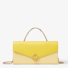 FF Diamonds wallet with geometric flap and diagonal FF logo. Inside, it features a gusseted compartment with six card slots and a zip pocket. Completed by a handle and removable thin chain shoulder strap. Made of smooth calfskin and full-grain leather in lilac and light lilac. Gold-finish metalware.