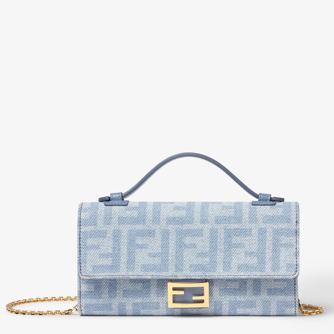 Baguette continental wallet with geometrically shaped flap embellished with a top handle, FF clasp and fine, removable chain shoulder strap. The interior features a wallet layout with spacious gusseted compartment, a zip pocket and six card slots. Made of organic cotton FF denim with a light blue wash. Tone on tone leather details. Gold-finish metalware.