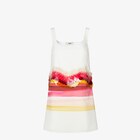 Sleeveless, flared short dress. Square neckline, front and back, and wide shoulder straps. Made of white cotton poplin. Venetian Stripes motif printed at the waist in raspberry red and yellow, with oversized round sequins embroidered in the same tones.