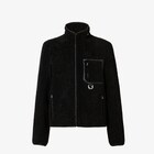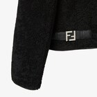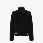 Reversible blouson with high collar and long sleeves. Side pockets and vertical zip pocket on the chest. Side straps at the waist with metal FF details. Visible front zip fastening. Made of black curly shearling. Napped interior with tone on tone leather trim. Embellished with palladium metal FF ring on the front.