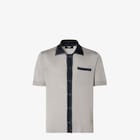 Short-sleeved cardigan with collar and left-side breast pocket. Button fastening. Made of grey viscose yarn with intarsia FF logo on the left-side hem. Collar, fastening and breast pocket edge in dark blue with contrasting stitching.