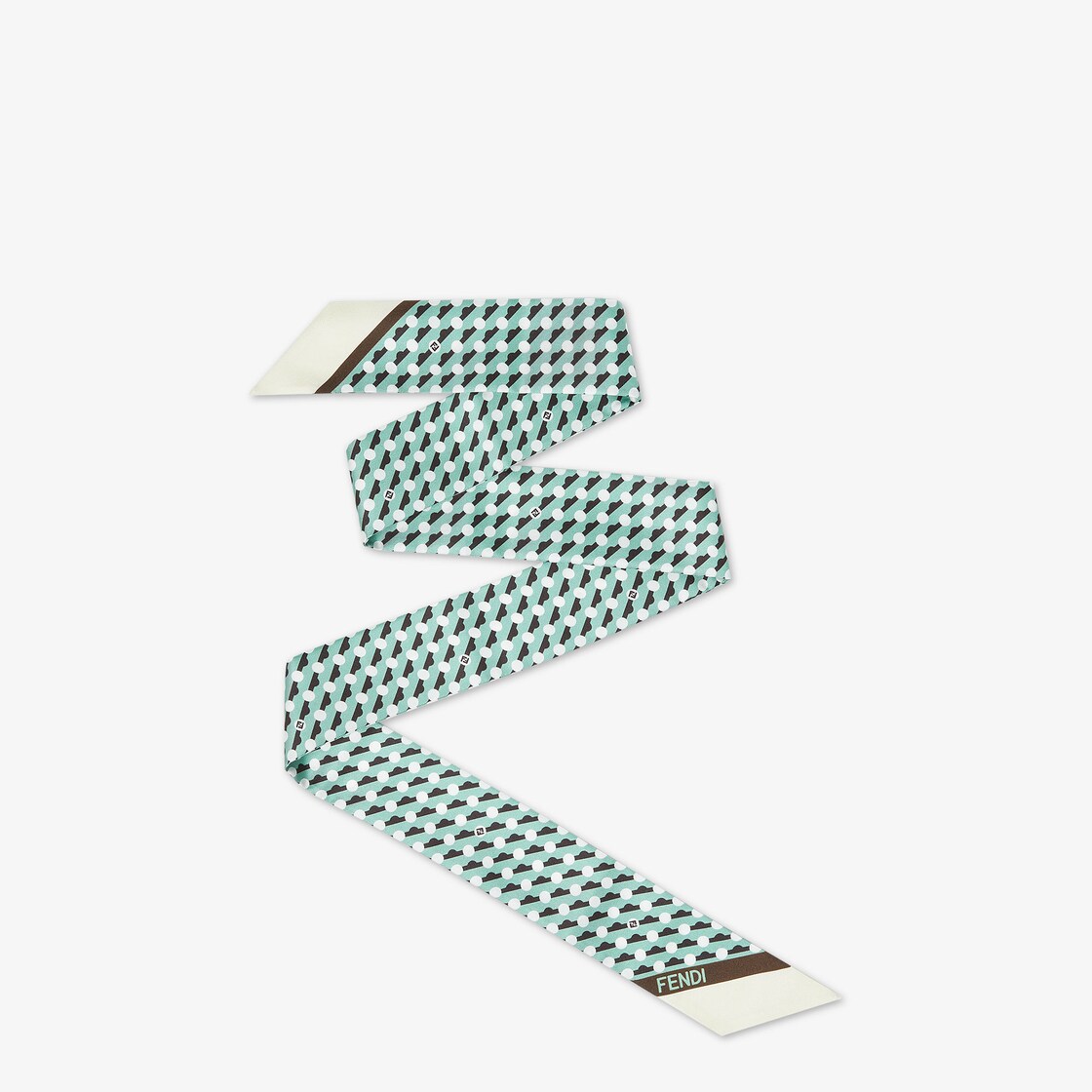Two-sided wrappy. Can be worn around the neck, knotted at the wrist or used to accessorise a bag with a touch of colour. Made of silk. Decorated with Fendi Dots motif in green, featuring micro polka dots interwoven with diagonal stripes and FF logo. Finished with contrasting colour block edges.