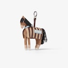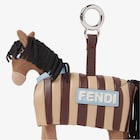 Fendi-Pferdchen-Anhänger aus Veloursleder in Beige. Mit Mähne und Schweif aus Nappaleder in Schwarz, streifenförmig verarbeitet. Satteldecke aus mehrfarbigem Nappaleder in Beige- und Brauntönen mit vertikalen Relief-Streifen und Fendi-Stickerei.