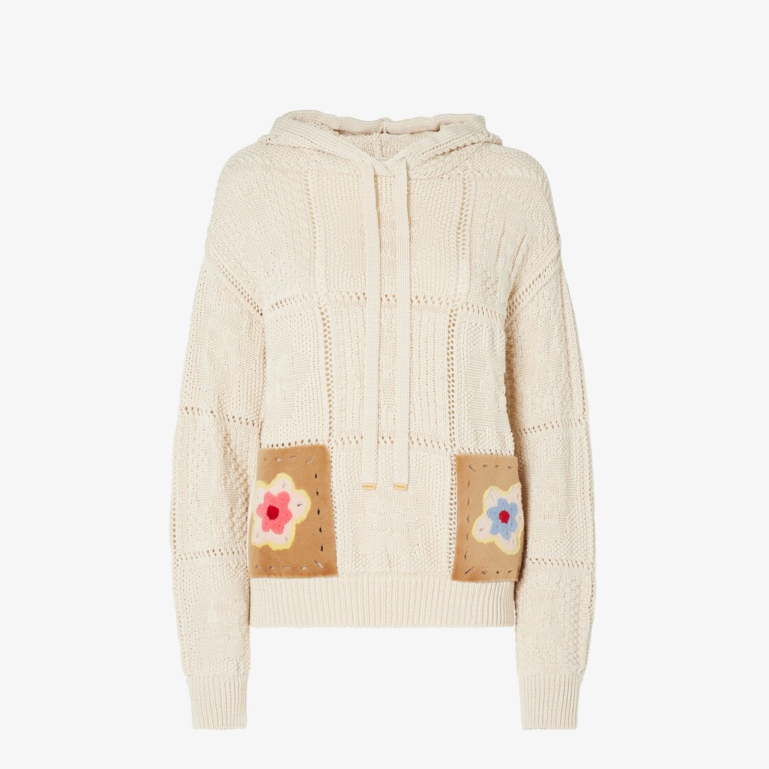 Pullover mit langen Ärmeln und Kapuze. Bündchen und Saum im Rippenmuster. Aus Baumwollgarn in Hellrosa mit durchgehender Häkelverarbeitung. Mit Taschen mit Sunny Side Flowers aus Nerz an der Vorderseite in Beige, Rosa und Hellblau.