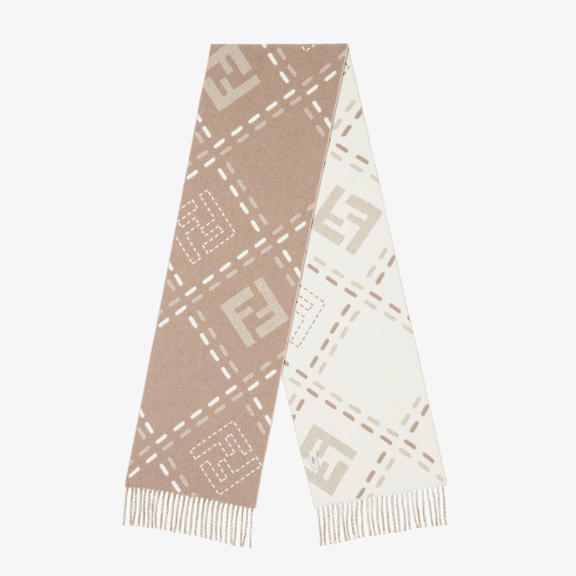 Langer Schal mit Fransen. Aus Wolle in Taupe mit Makro-Karomuster mit Jacquard-Selleria-Ziernähten, inspiriert von der ikonischen Fendi-Verarbeitung und dem FF-Logo interpretiert auf zwei verschiedenen kontrastierenden grafischen Texturen.